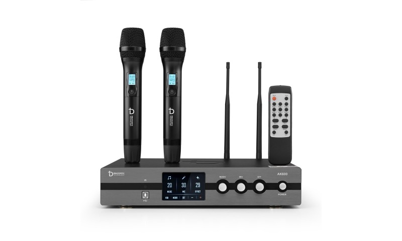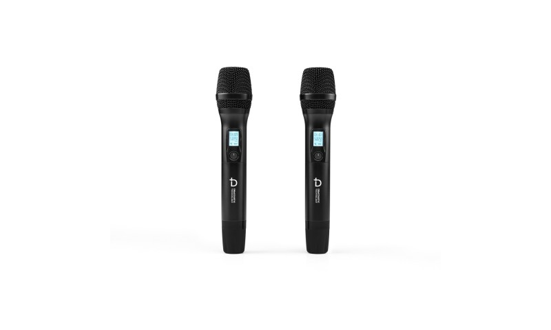 Bộ sản phẩm còn có 2 tay micro không dây Dbacoustic nhỏ gọn, làm bằng hợp kim phủ nano chống trầy xước, chống bám vân, tạo cảm giác thoải mái cho người dùng khi cầm nắm. Trên thân micro không dây này cũng được trang bị 1 màn hình LCD nhỏ hiển thị tần số, dung lượng pin và 1 nút nguồn mềm, rất dễ thao tác.