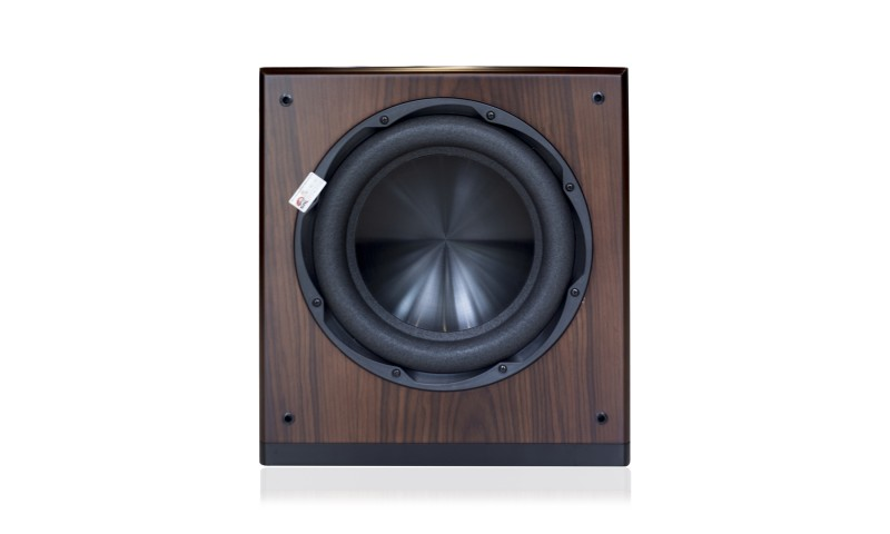 Vỏ thùng được chế tạo bằng gỗ cao cấp, mặt trước là tấm ê căng bảo vệ củ bass bên trong. Ở ngay trên củ bass cũng được in logo thương hiệu. Đây mới là điểm ấn tượng của loa. Logo màu trắng nổi bật trên màng loa màu đen. Gân loa bằng cao su to và chắc chắn.