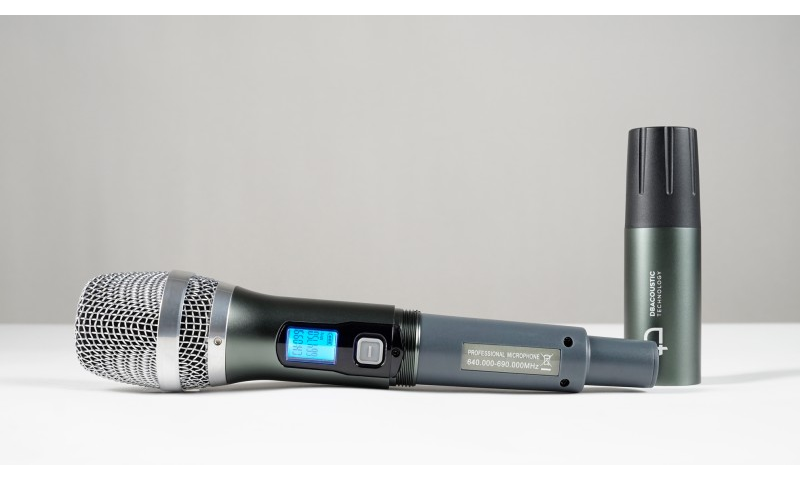 Thân micro không dây Micro K5000S được phủ lớp sơn bóng đẹp mắt màu xanh rêu, trên thân là tên thương hiệu DBacoustic, công tắc và một màn hình LCD sẽ hiển thị các thông tin khi micro hoạt động.